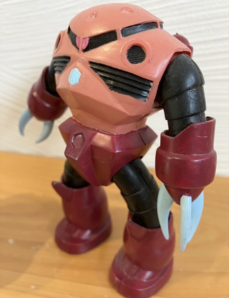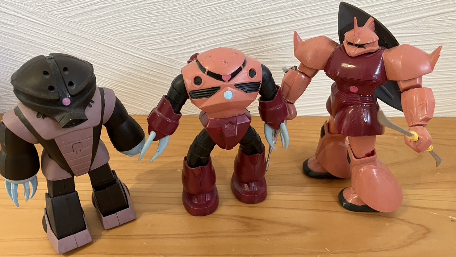 一番右の物(ゲルググ)は腰が曲がってしまって元に戻りません(痛そうですね)。強引に戻すと壊れそうなので、とりあえずそのままにしています。