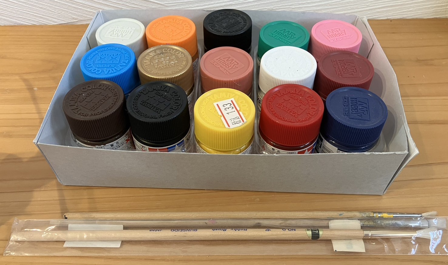 商品は塗装がされていませんので、リアルに仕上げるには、塗装が必要です。急遽塗料と筆、接着剤も購入するハメになりました。